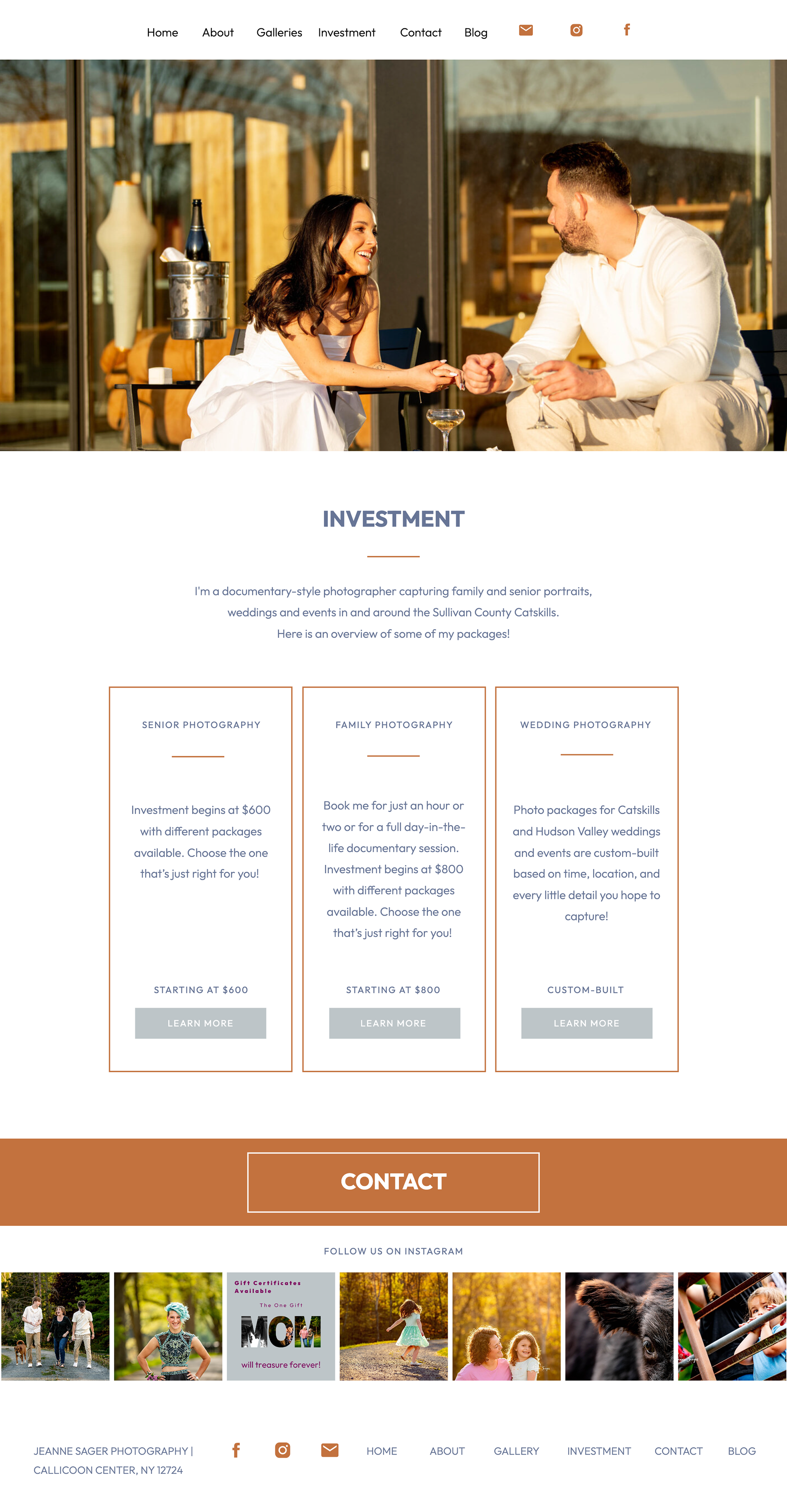 Jeanne Sager is a photographer located in the Catskill area. She was interested in designing a website that showcased her personality and allowed for her customers to trust her before booking with her.